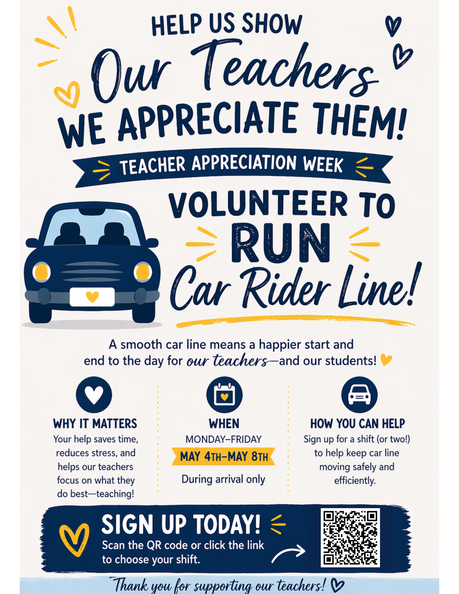 🚗💚 Help Us Celebrate Our Teachers! 💛🚗Teacher Appreciation Week is coming up May 4th–8th, and we have a special way for our Wolf Meadow families to help show some love!We’re looking for parent volun...