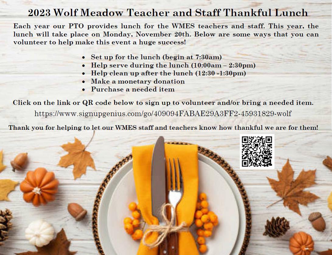 Hello, everyone! We are excited for the upcoming Thankful Lunch for the WMES staff and teachers. If you would like to get involved and help out with this event, please click HERE for more details and to sign up!
